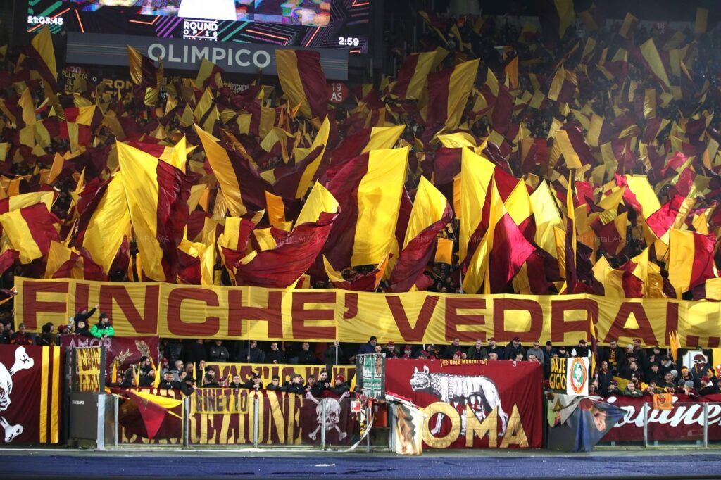 Coreografia giallorossa e spettacolo di luci per la notte del big match all’Olimpico